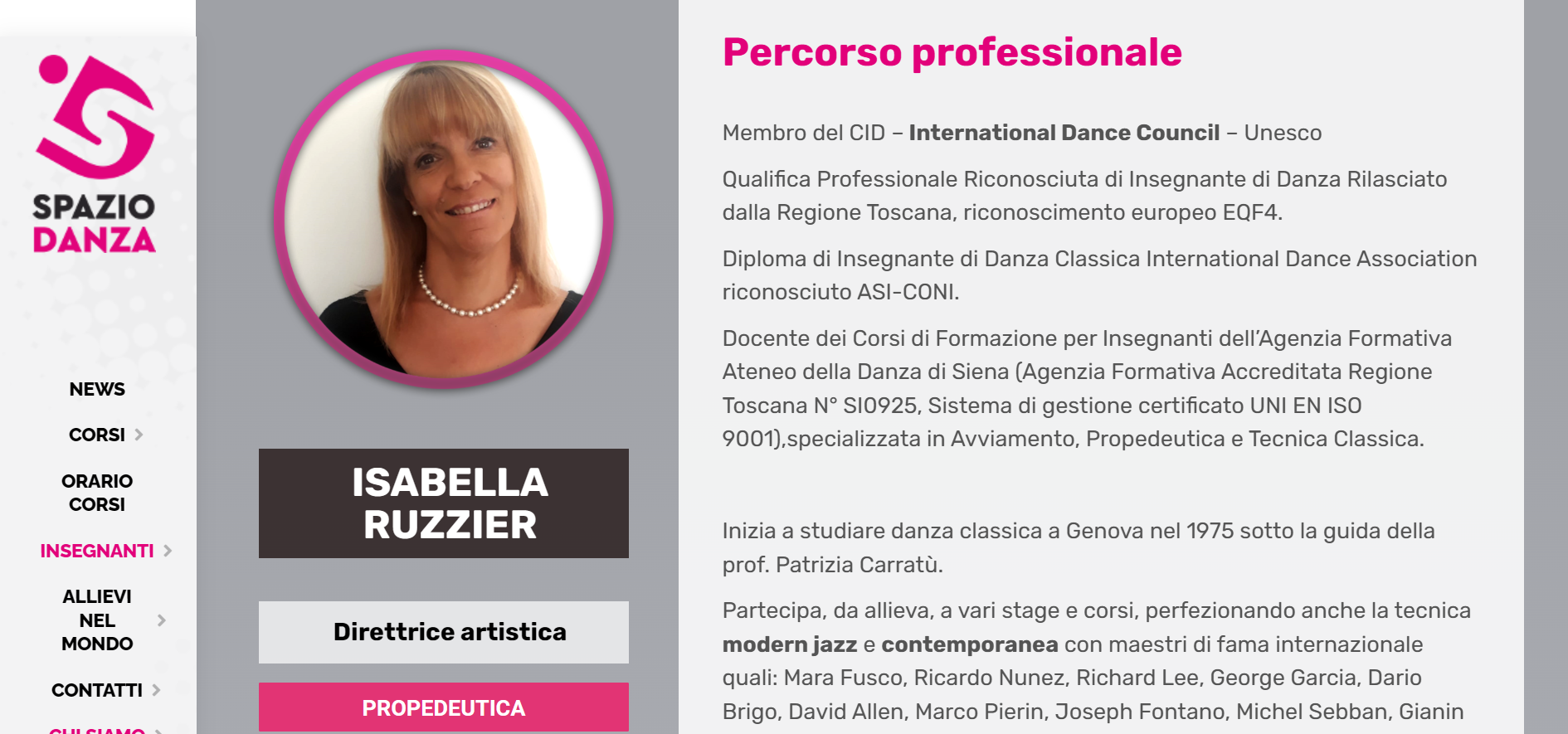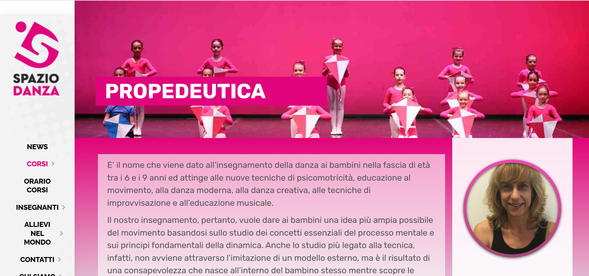 Spaziodanza è una autorevole scuola di danza di Genova. Il sito raccoglie tutta l'offerta dei corsi di danza offerti dalla scuola. Presenta una pagina profilo per tutti gli insegnanti e in specifiche aree informa gli iscritti e gli aspiranti ballerini di tutte le novità della scuola.