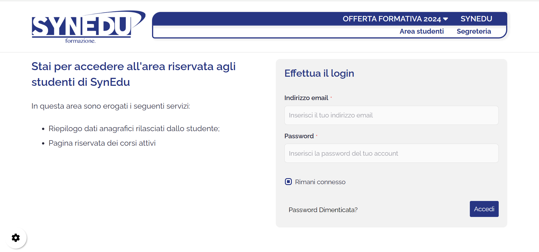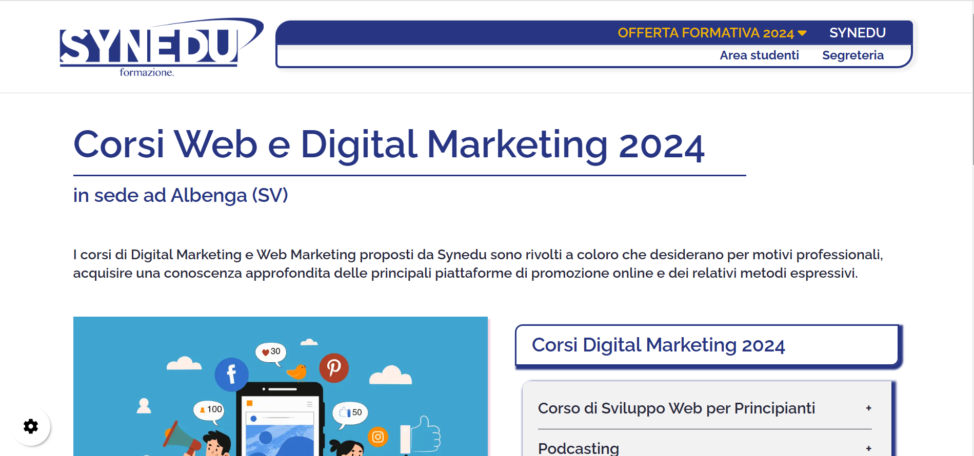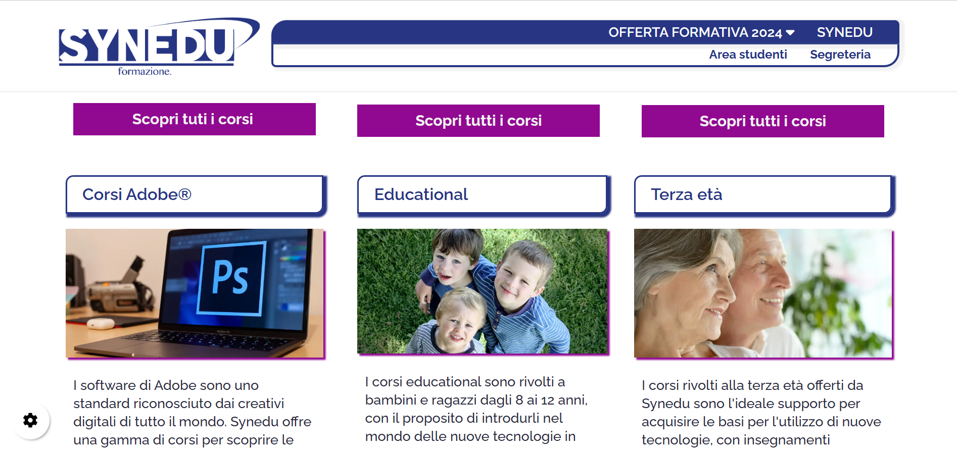 Synedu è un centro di formazione professionale di Albenga (SV). Il sito di Synedu non è solo il riferimento per conoscere le attività didattiche del centro di formazione., offerti sia in sede, che online attraverso una piattaforma di e-commerce ad attivazione diretta del corso dopo il pagamento. Il sito di Synedu presenta un'area riservata dedicata agli studenti i quali possono visualizzare i contenuti dei corsi di cui sono iscritti e accedere alle lezioni online e interagire con i tutor. Inoltre una seconda area riservata permette alla segreteria didattica e amministrativa di gestire i singoli iscritti sia dal punto di vista didattico che economico.